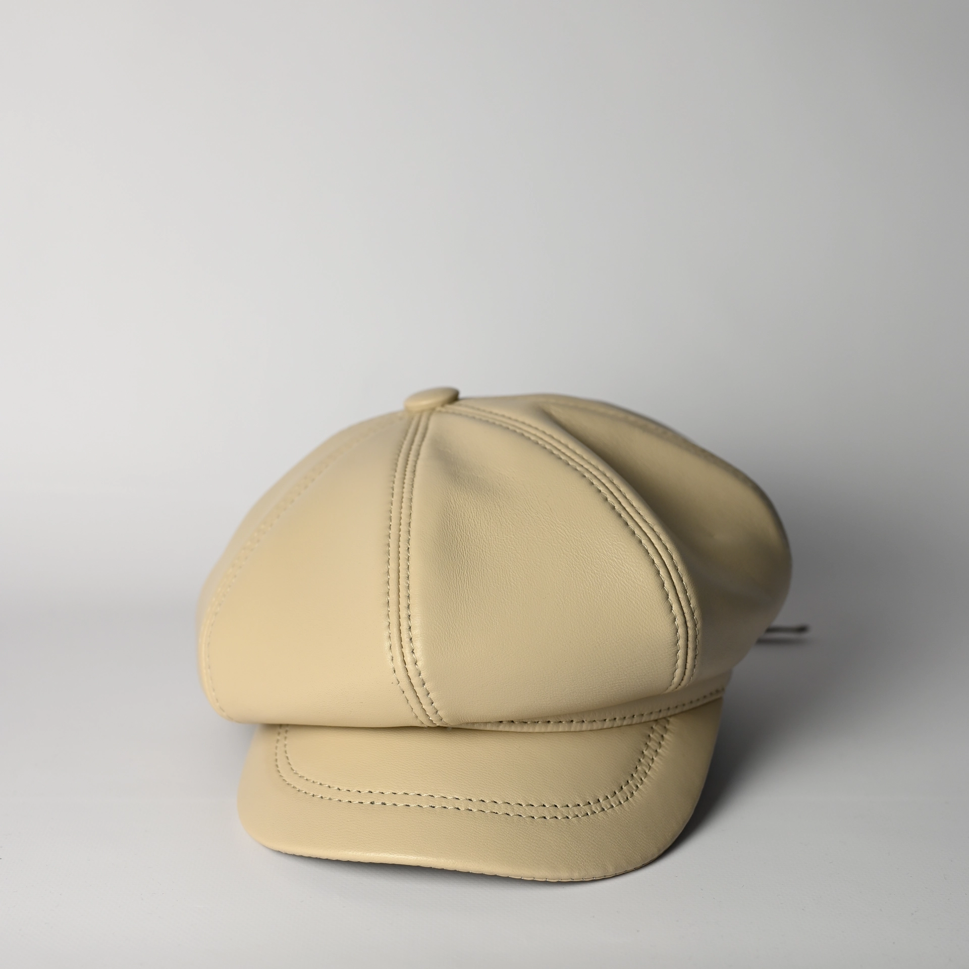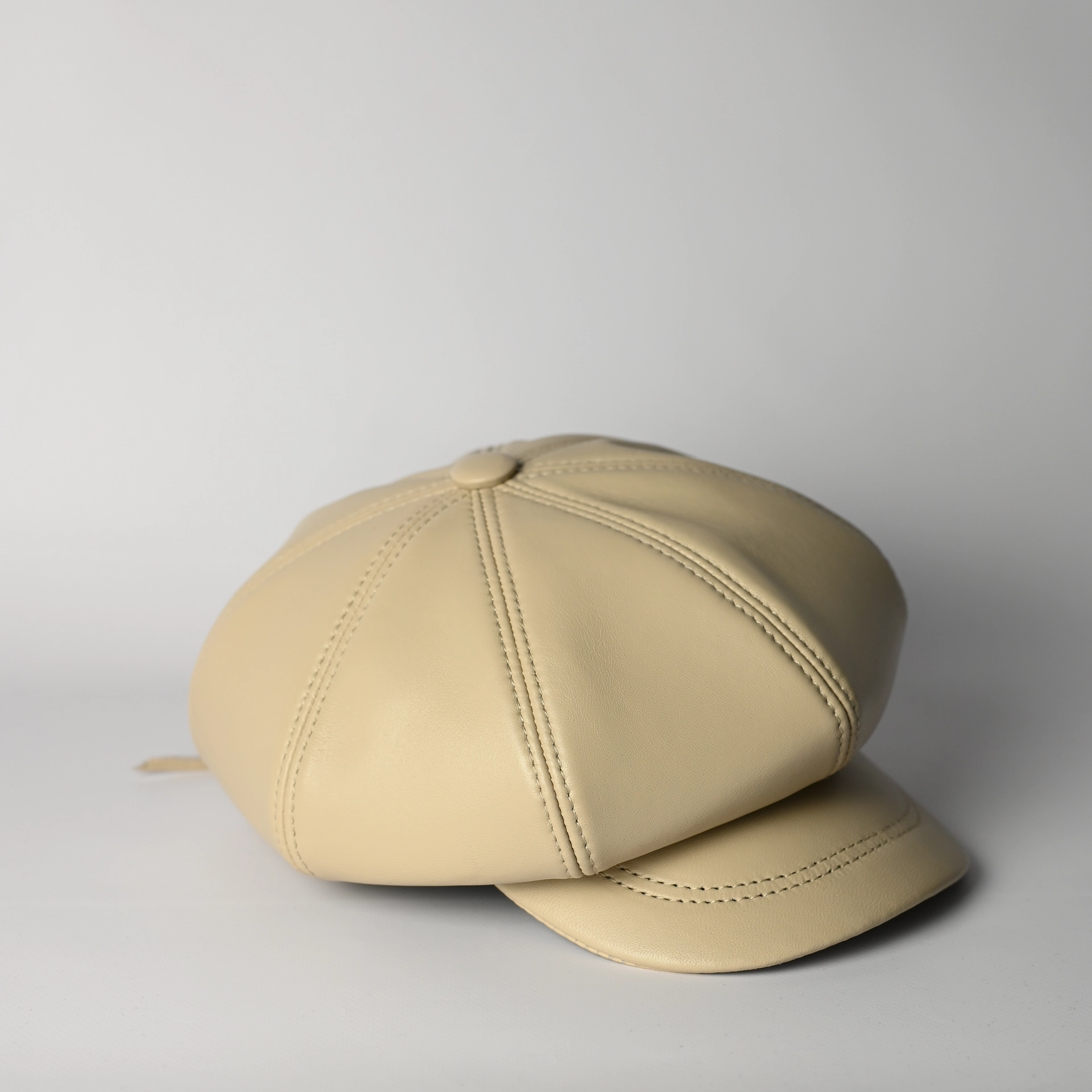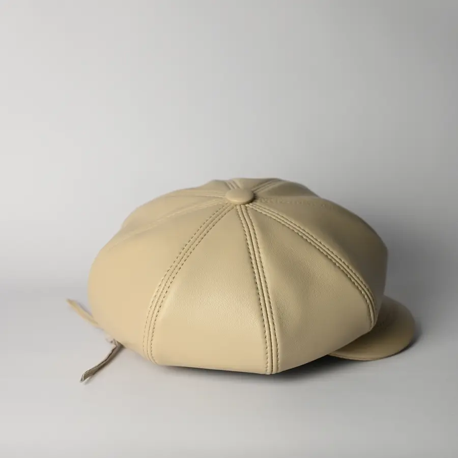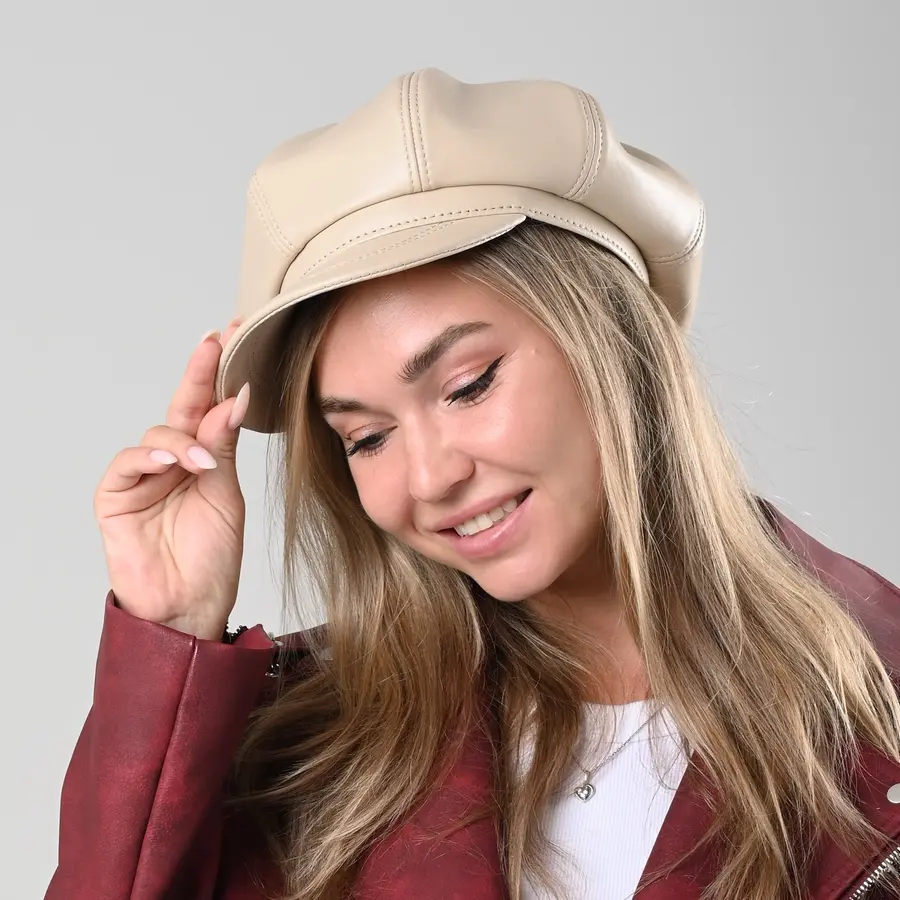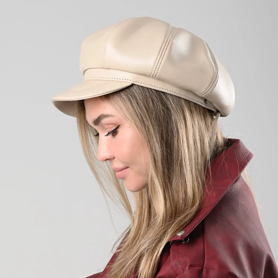 Кепка восьмиклинка кожаная женская бежевого цвета. Сделана из натуральной овечьей кожи. Подкладка имеется.
