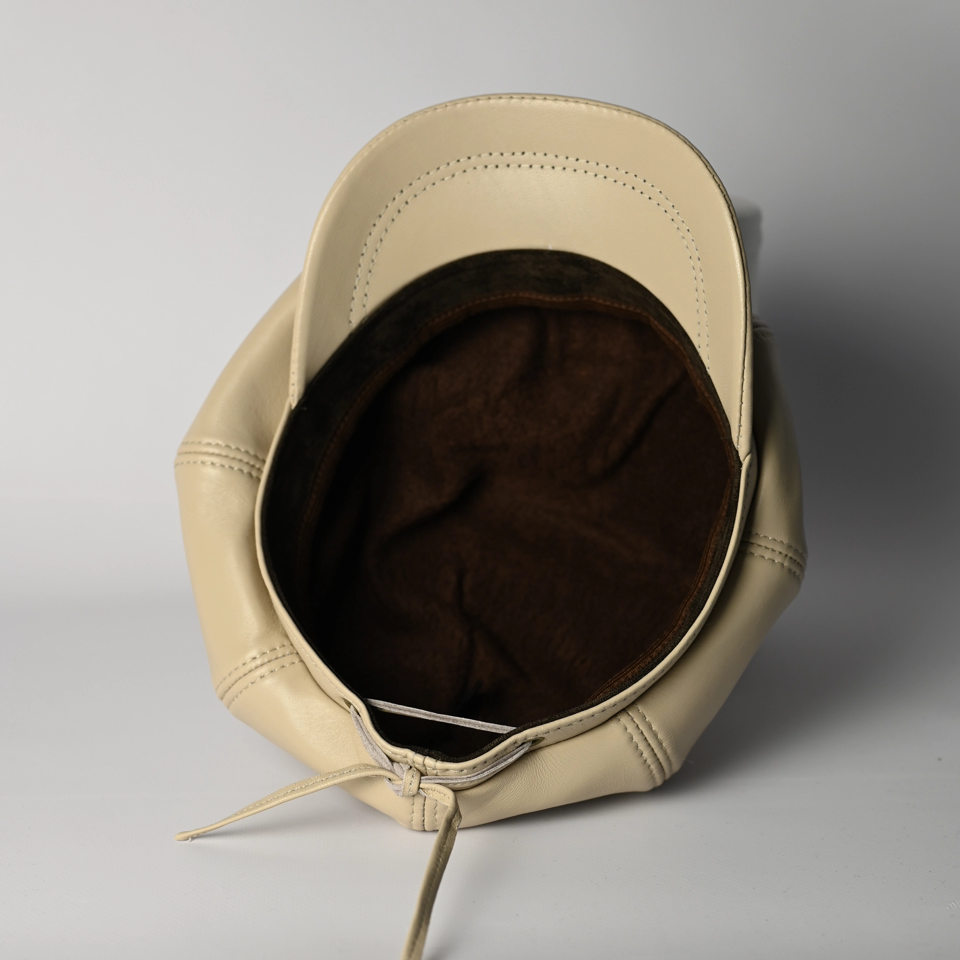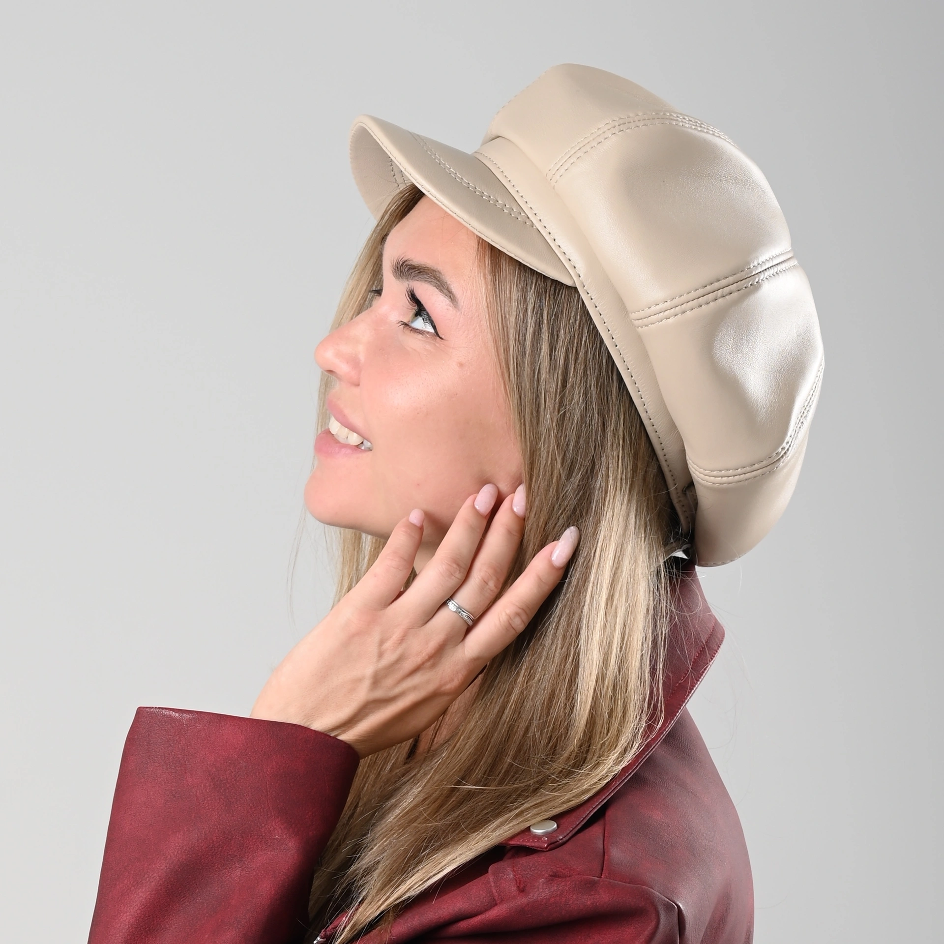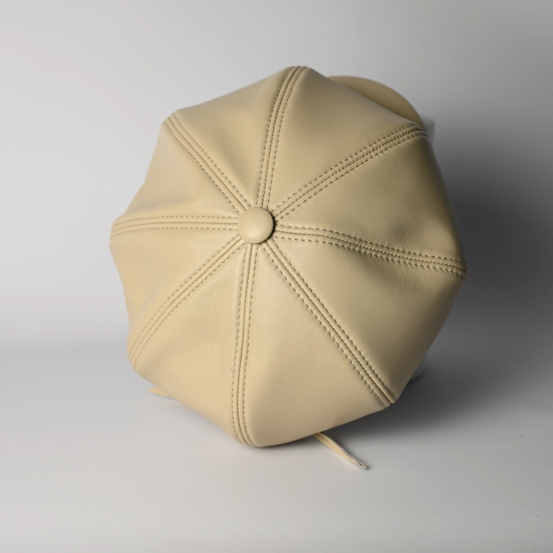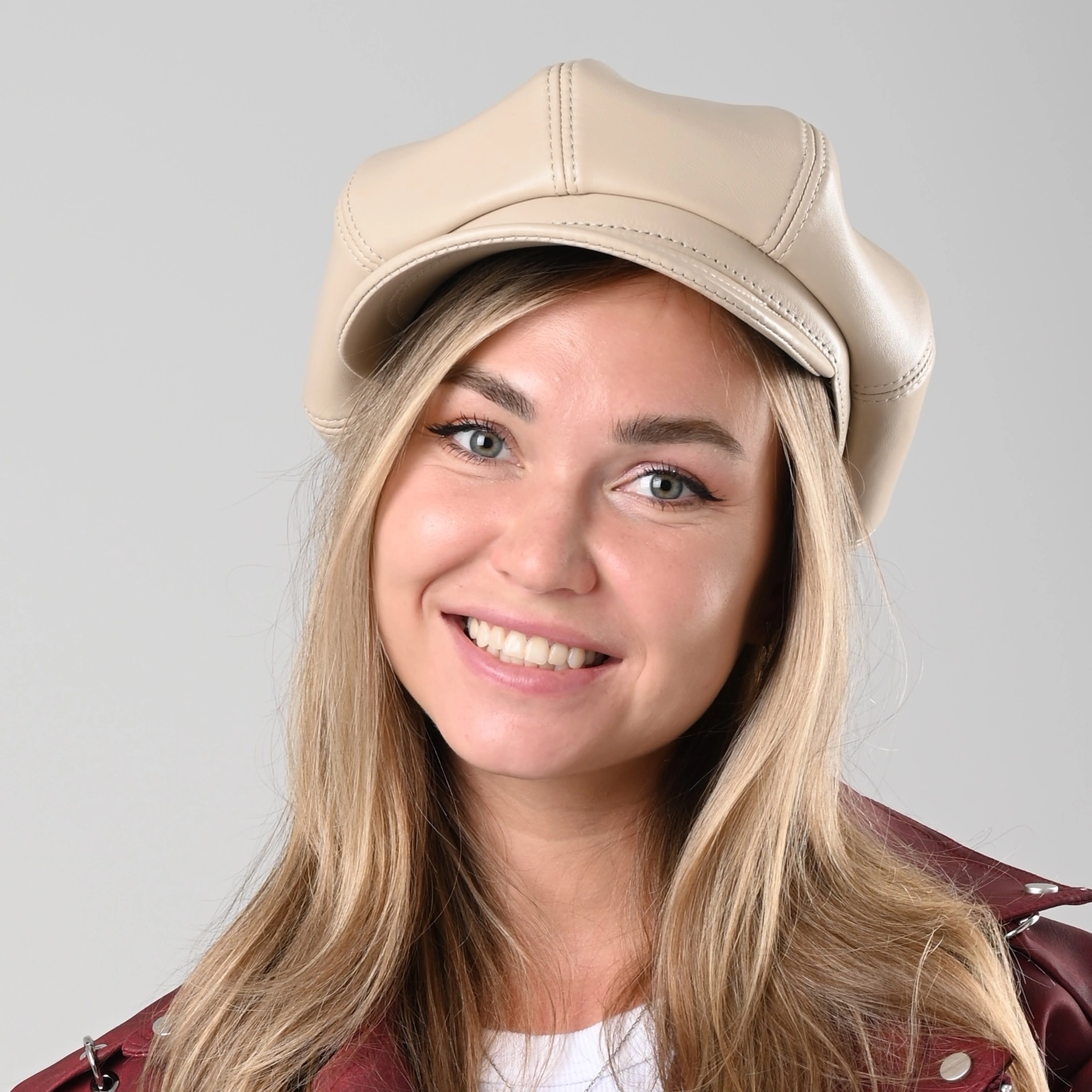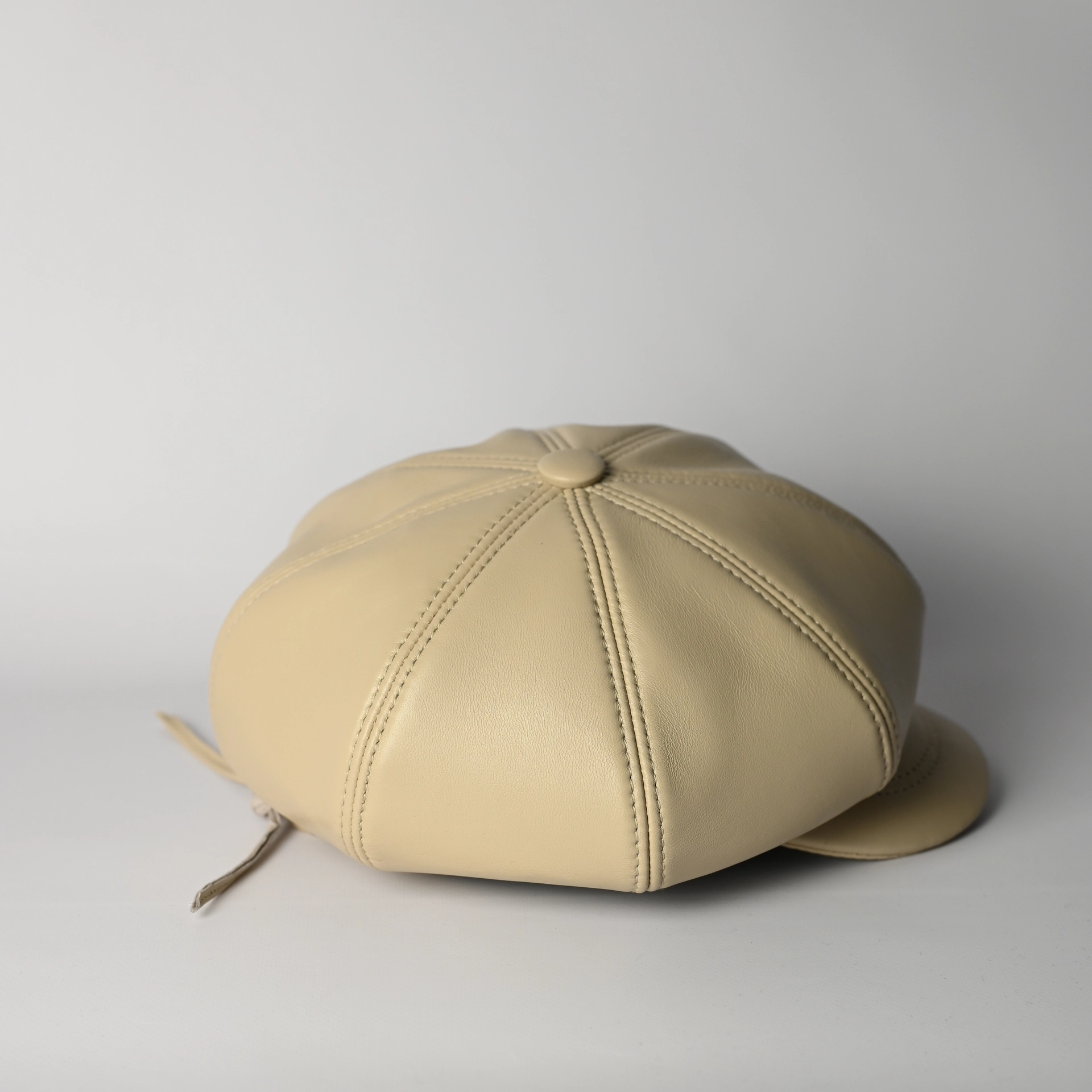 Кепка восьмиклинка кожаная женская бежевого цвета. Сделана из натуральной овечьей кожи. Подкладка имеется.
