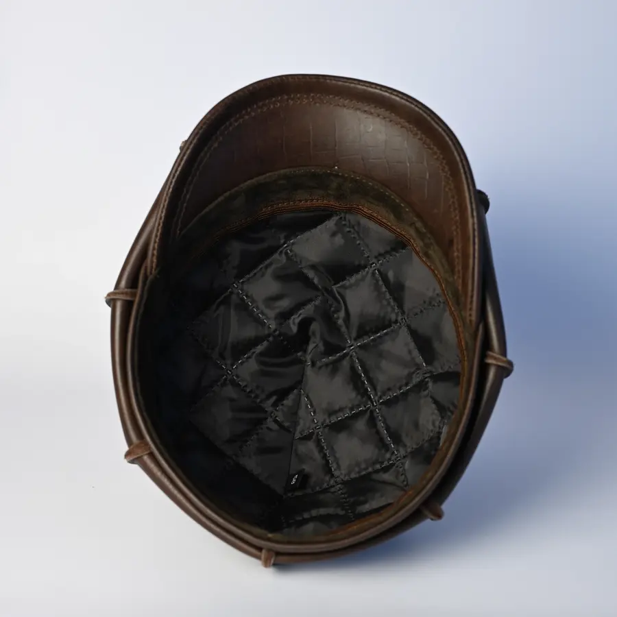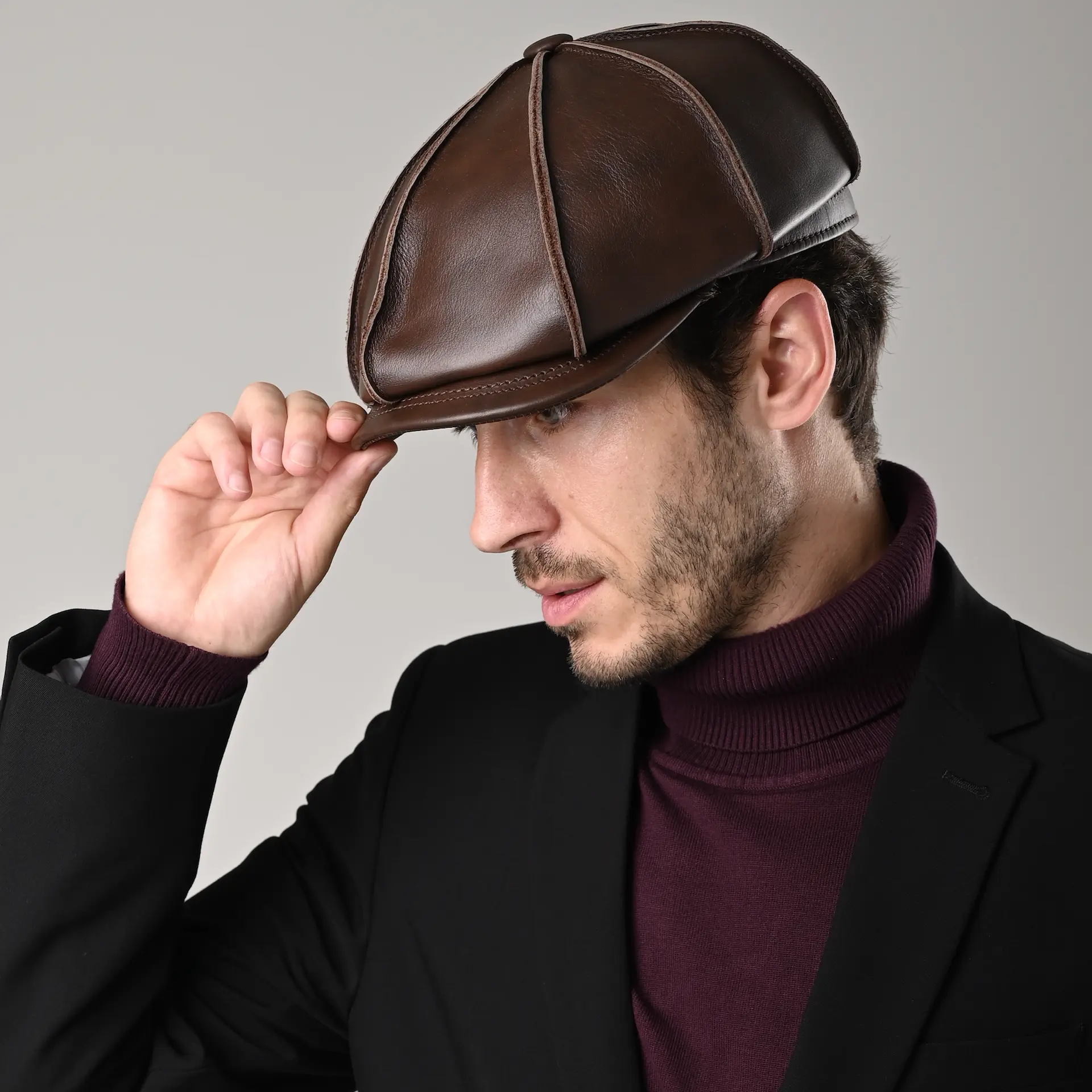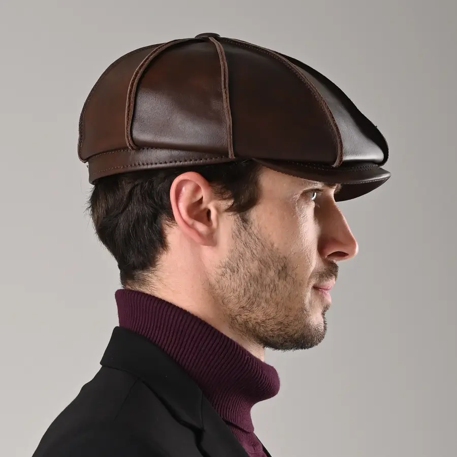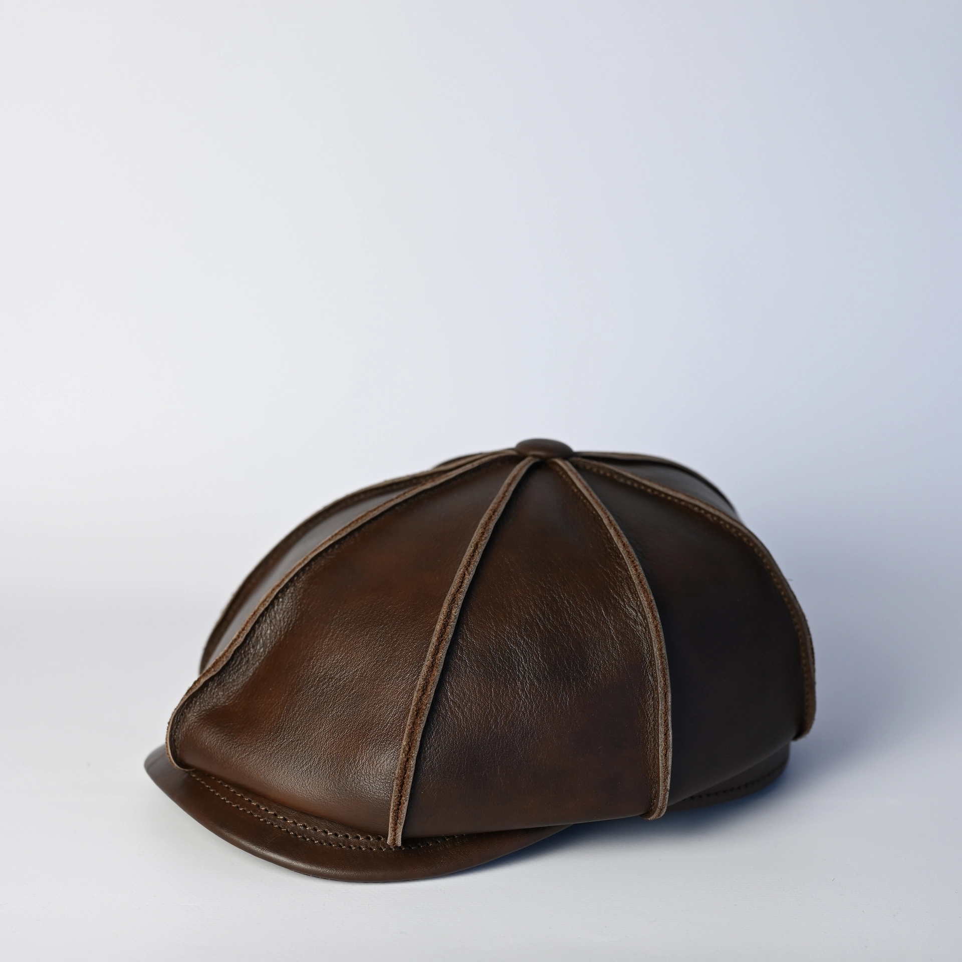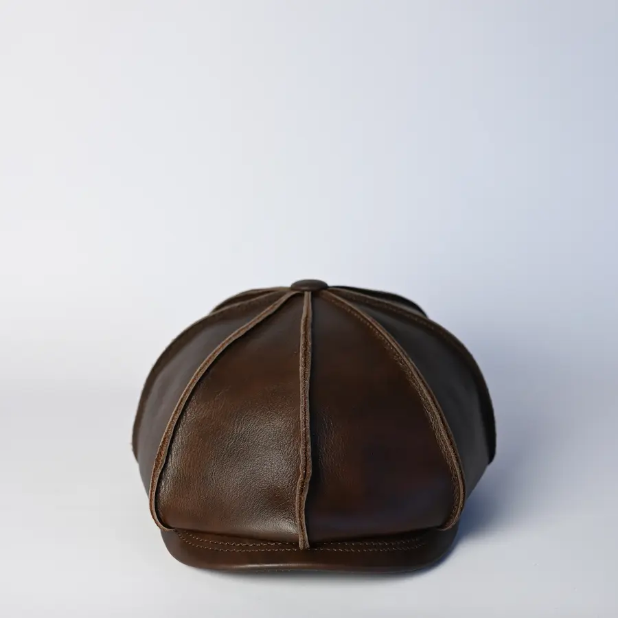 Кепка восьмиклинка кожаная коричневого цвета. Сделана из натуральной овечьей кожи. Подкладка имеется.