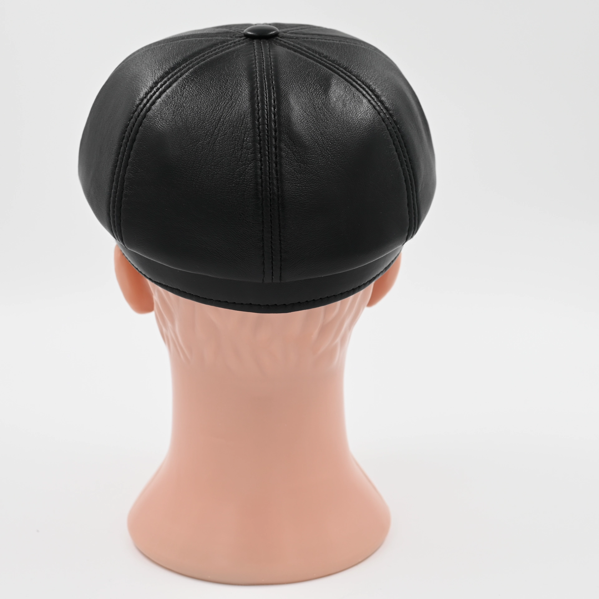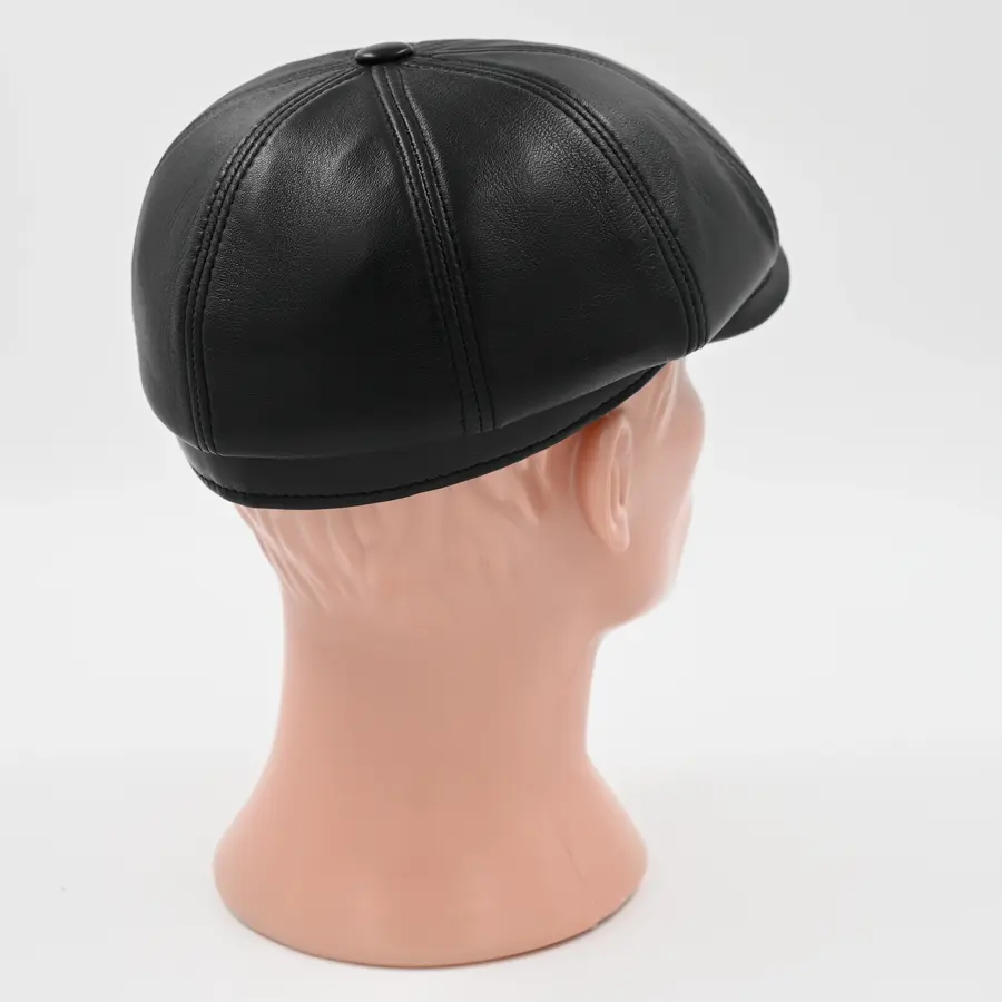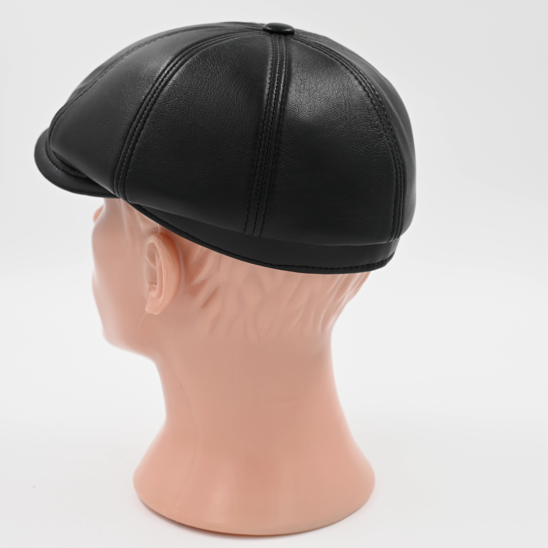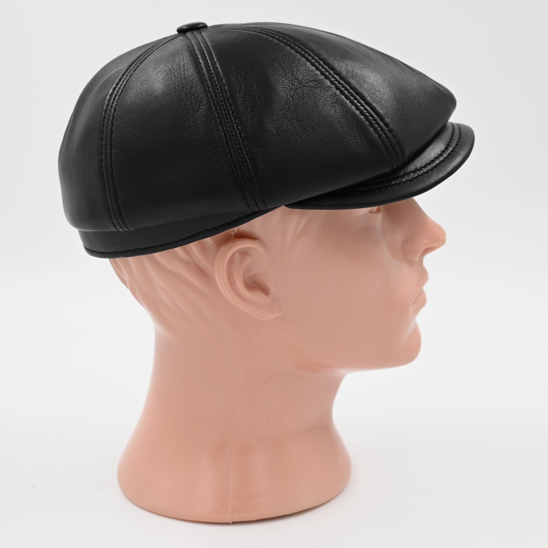 Кепка восьмиклинка кожаная черного цвета. Сделана из натуральной овечьей кожи. Подкладка имеется.
