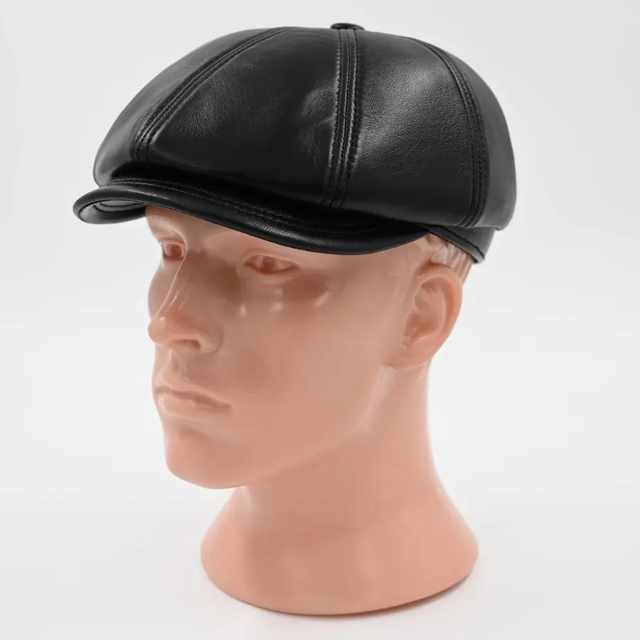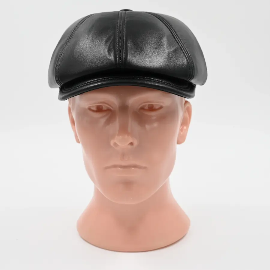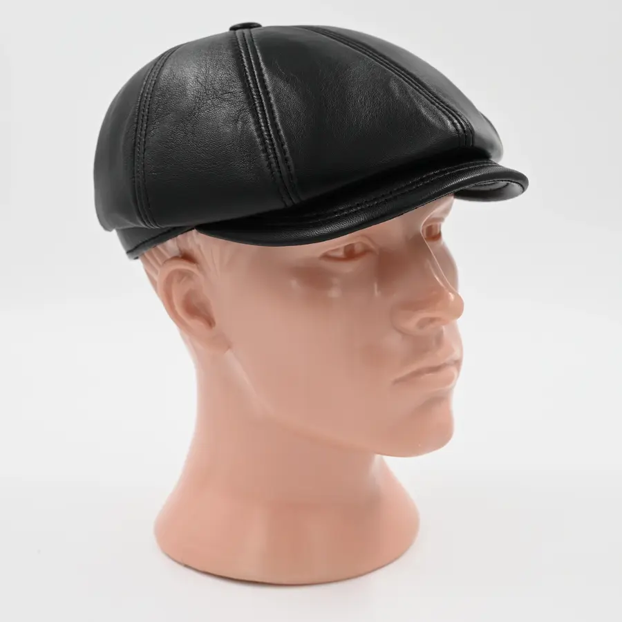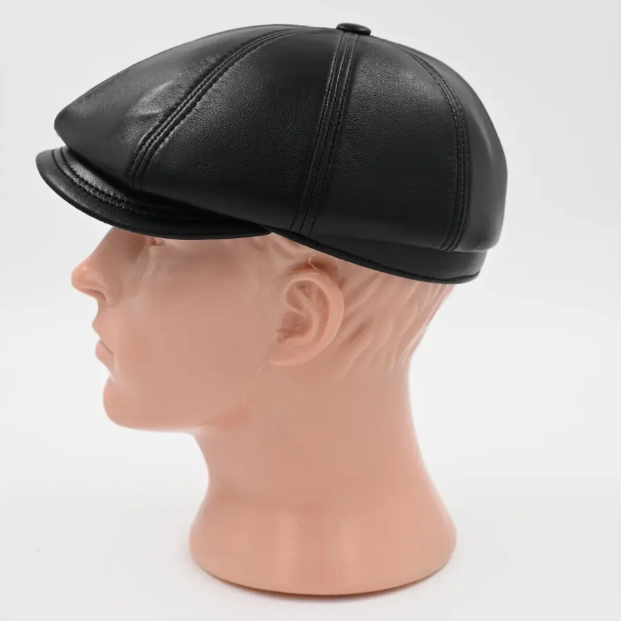 Кепка восьмиклинка кожаная черного цвета. Сделана из натуральной овечьей кожи. Подкладка имеется.